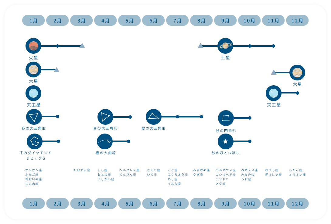 ※20:00頃を基準としております。 ※天候により惑星や星空が綺麗に見れない場合もあります。