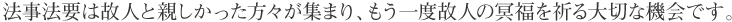 一般的に「法事」は、故人の追善供養を行う仏事の総称を指します。お経をあげてもらうことを「法要」と呼び、その後の会食を含めた行事全体が「法事」と呼ばれています。