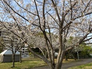 ホテル前の向洋東公園階段上のグラウンドにも芝生に桜の木があり、ちょっとしたお花見スポットです。ご来館い