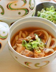 甘辛い出汁でじっくりと煮込んだコリコリ食感の牛スジと、あっさりとした出汁の関西風のうどんは相性抜群!薬味と一緒にうどんにぶっかけて(ぼっかけ)お楽しみください。