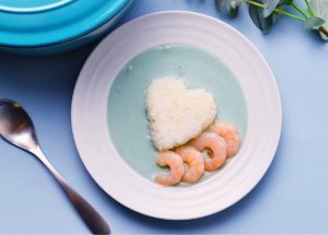 キレイなSORA色は、バタフライピーの花びらがもつ天然の青色で色づけ。プリプリのエビと北海道産生クリームのクリーミーな、まろやかさがたまらない味わいです。