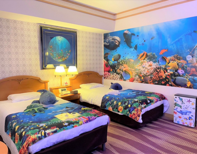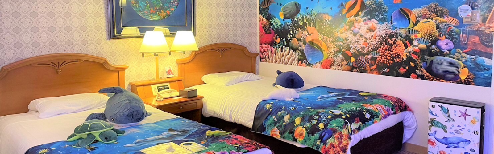 小学生(12歳)まで添い寝無料! 部屋の壁や布団カバーなどが水族館仕様となった特別なお部屋! お部屋にある2つの水槽には本当の魚が泳いでいて、エサをあげることもできます(エサはチェックイン時にお渡しいたします) 室数 1室 お部屋の広さ 28.0m2 お部屋の階数 17階 お部屋の向き 西向き ベッドサイズ 幅110cm×奥行き203cm お部屋の設備 加湿空気清浄機(プラズマクラスター)【無料】無線LAN(Wi-Fi)【無料】 宿泊予約はこちらから