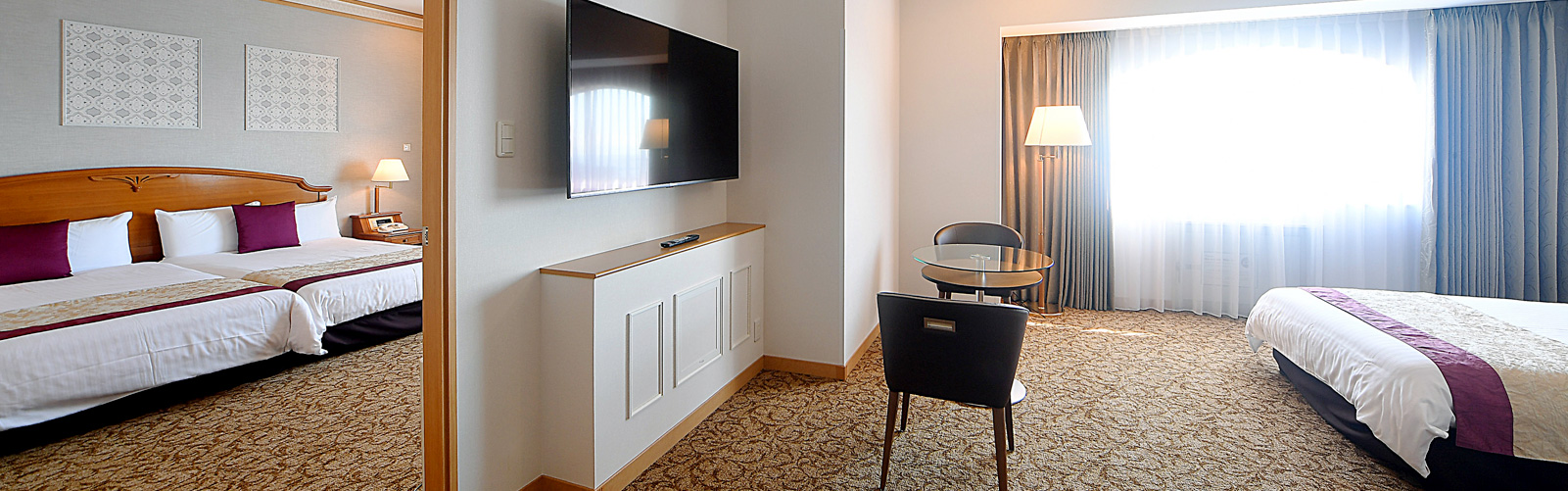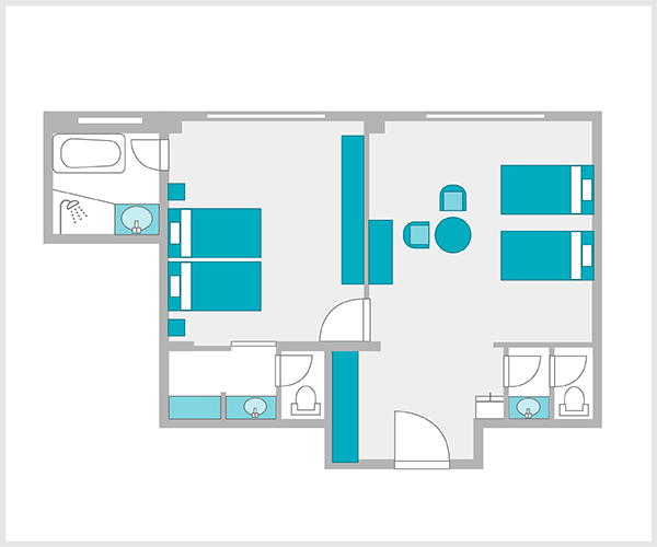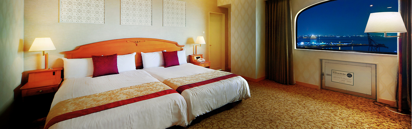 客室最上階のコーナーに位置し、ベッド4台のマットレスは西川のAir01を使用しています。