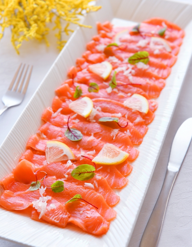 塩やハーブで味付けしたサーモンを燻製に。しっかりと味がしみ込み、スモーキーな風味と濃厚な旨みに、塩気の効いたケッパーがアクセントとなっています。