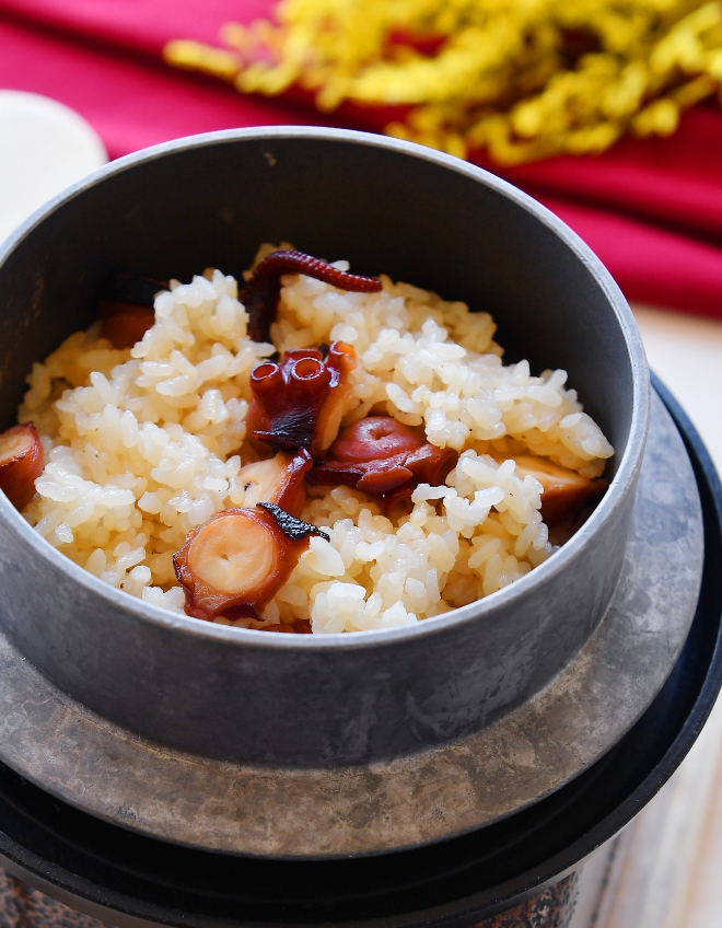 やわらかく煮込んだタコと生姜の炊き込みご飯。生姜の香りが食欲を刺激し、タコのうま味がダイレクトに味わえる明石の郷土料理 タコ飯は、おかわり必至メニューです。