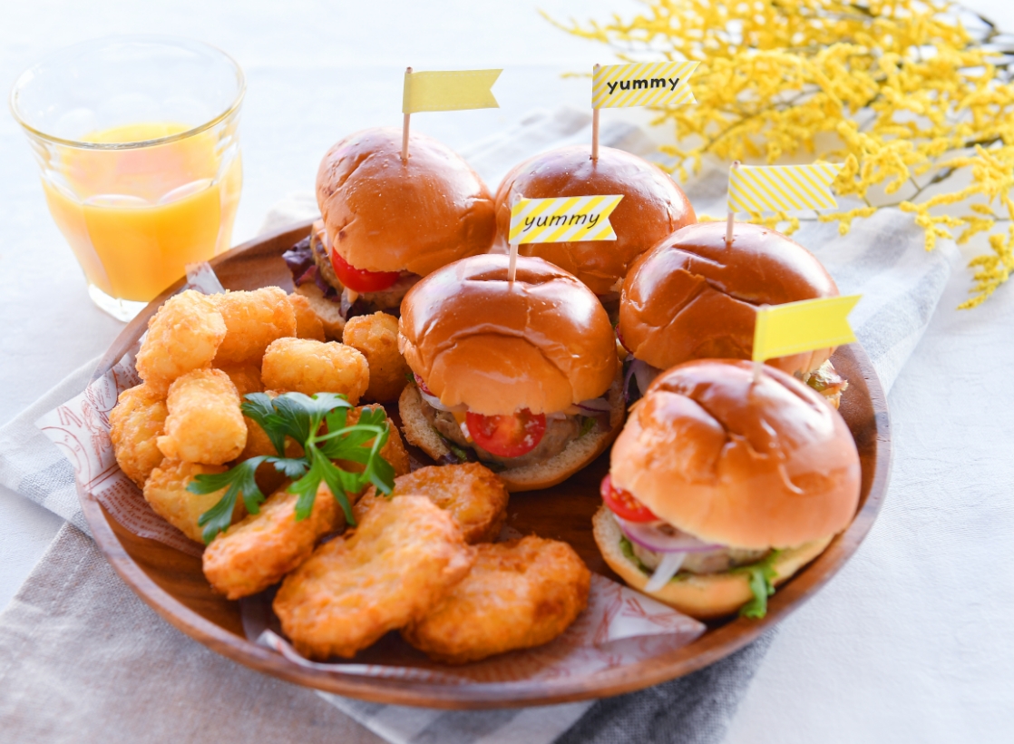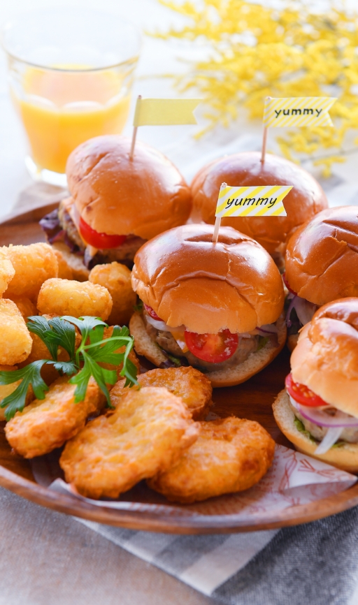 好きな具材を選んでオリジナルのミニハンバーガーを作ったり、チキンナゲットやハッシュドポテトとセットにしたり。お子さまにもお楽しみいただけます。
