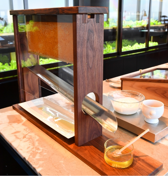 ライブキッチンでシェフが焼き上げる、できたてふわふわオムレツのソースは「デミグラスソース」「トマトソース」「青のりソース」の3種類からお選びいただけます。