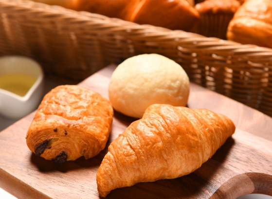 神戸っ子にはおなじみの老舗「神戸ベル」の全粒粉ねじりパンや米粉パンに、サクサクのクロワッサンや、パン・オ・ショコラなどをご用意しております。