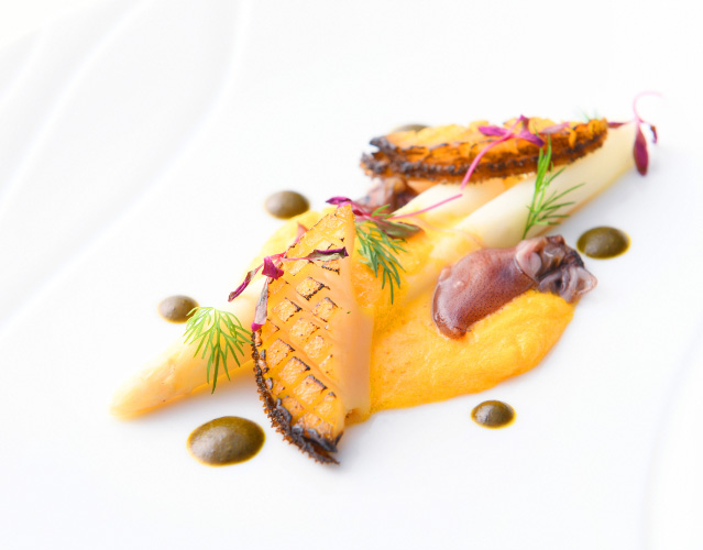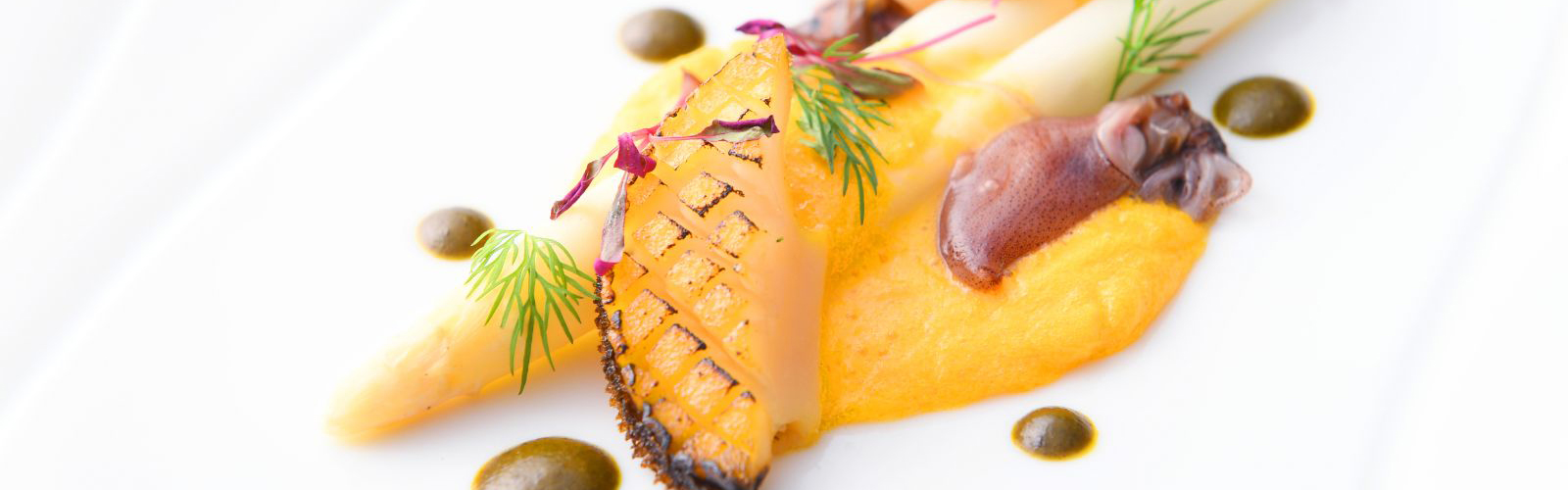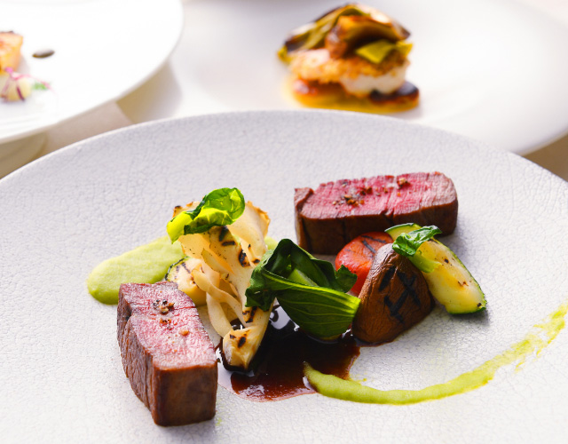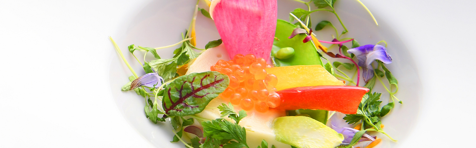 最上階のメインダイニング近海で水揚げされた鮮魚を主に、地産地消にこだわった旬の食材。