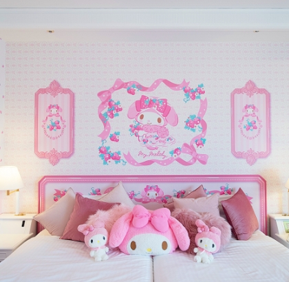 パステルピンクのリボンやイチゴ、パールの可愛い小物がちりばめられたお部屋で、マイメロディと一緒に楽しいひと時をお過ごしください。