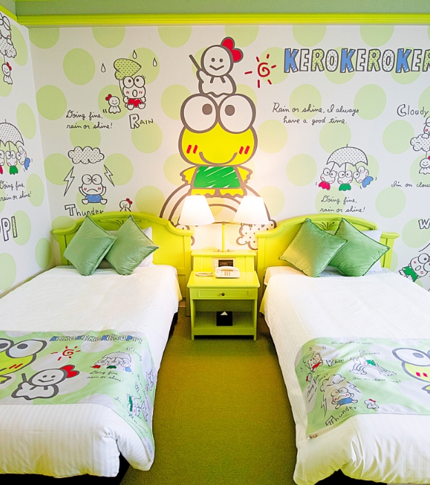 お洒落なライトグリーンのドットを背景にどんなお天気でも元気いっぱいのけろっぴとお友達のデザインルーム。いろんな表情のけろっぴが描かれており、見ているだけでワクワクするようなお部屋です。