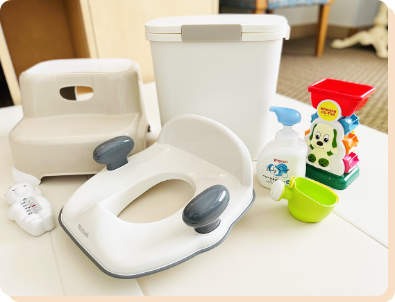 お部屋には、空気清浄機、補助便座、踏み台、おむつペール、ベビーソープをご用意しております。