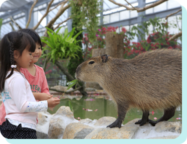 花と動物と人とのふれあい共生パーク。鮮やかな花々が咲き誇るグラスハウスの屋内エリアでは、カピバラなど愛らしい動物たちに近距離で出会うことができます。